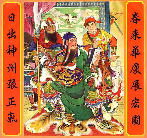 年画画面线条单纯、色彩鲜明、气氛热烈愉快,如《春牛图》《岁朝图》《合家欢》《胖娃娃》等。它一般以神仙、历史故事、戏剧人物等作题材,有的夹杂着“神祇护宅”的观念,如“神荼郁垒”、“天官”、“秦琼敬德”等。