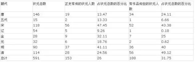 据不完全统计,古代正史有传和有作品传世的状元,其分布情况如下: