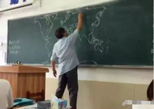 在地理课上,手绘世界地图,这样的绝活太逆天啦。照片上的老师在没有任何参照的情况下,仅用一根粉笔就在黑板上画出了完整的世界地图。据悉,这名身怀绝技的老师是东北师大附中历史老师赵登明。