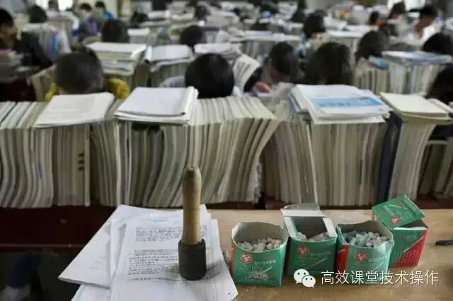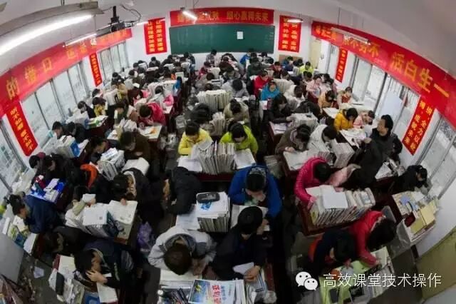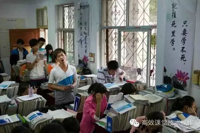 高中556班,早读时间。教室内,墙上的标语极为醒目。厚厚的各种学习资料能把坐在座位上的同学挡得只露出一个脑袋顶。