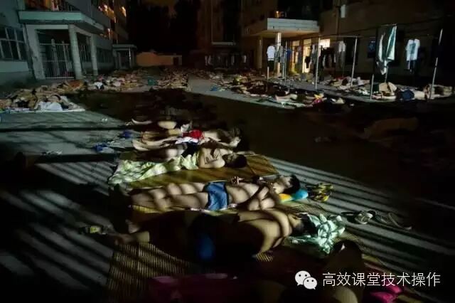 高中男生宿舍,学生们躺在院子里睡觉。这种季节和天气,学生们一天只能睡三四个小时。