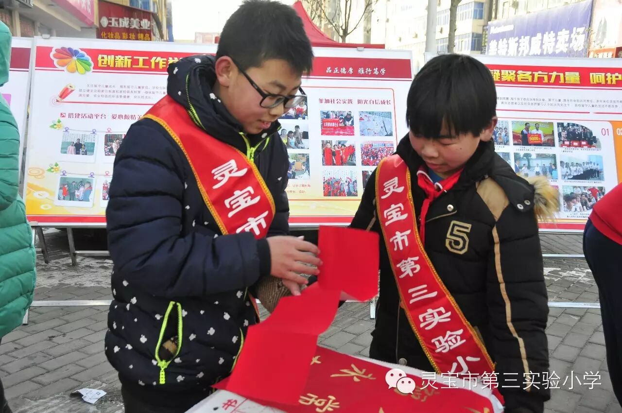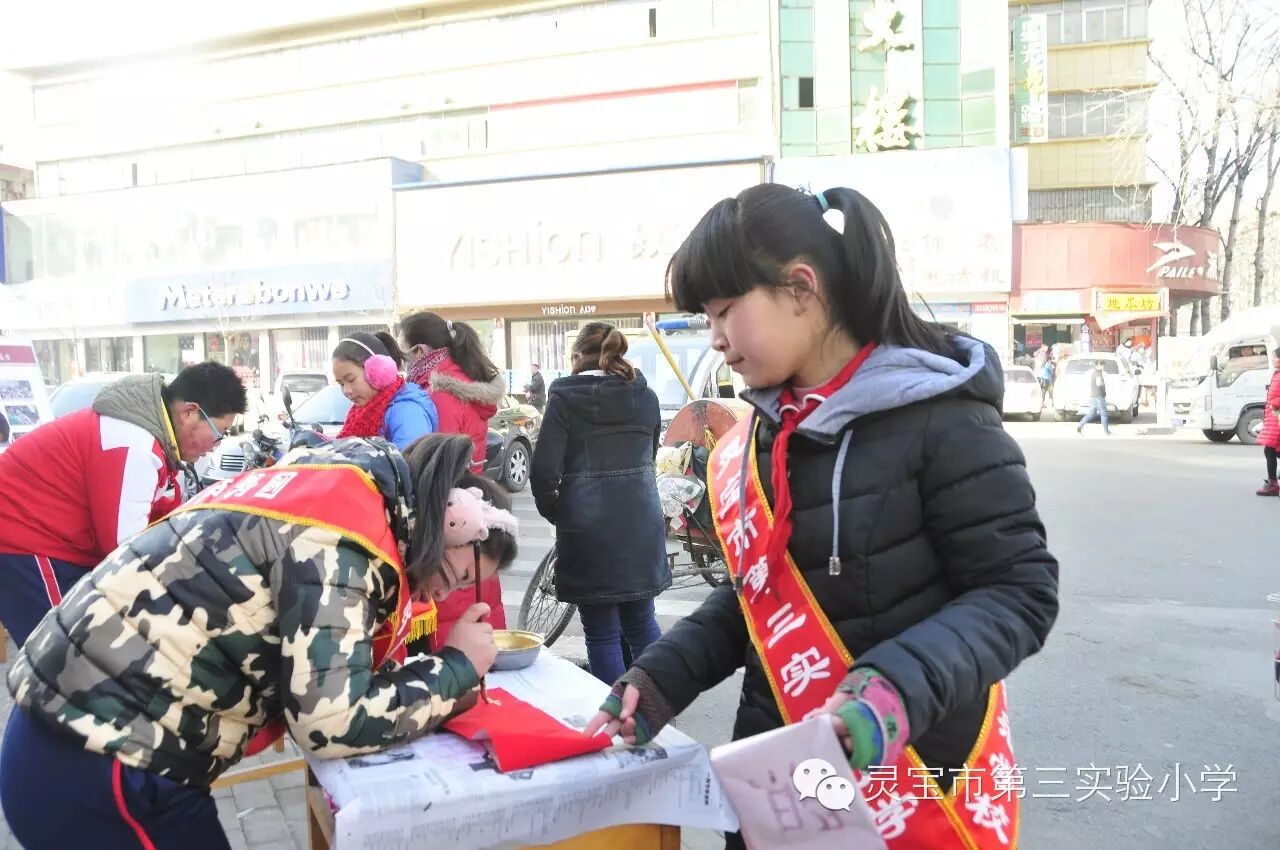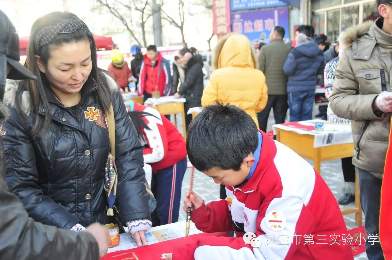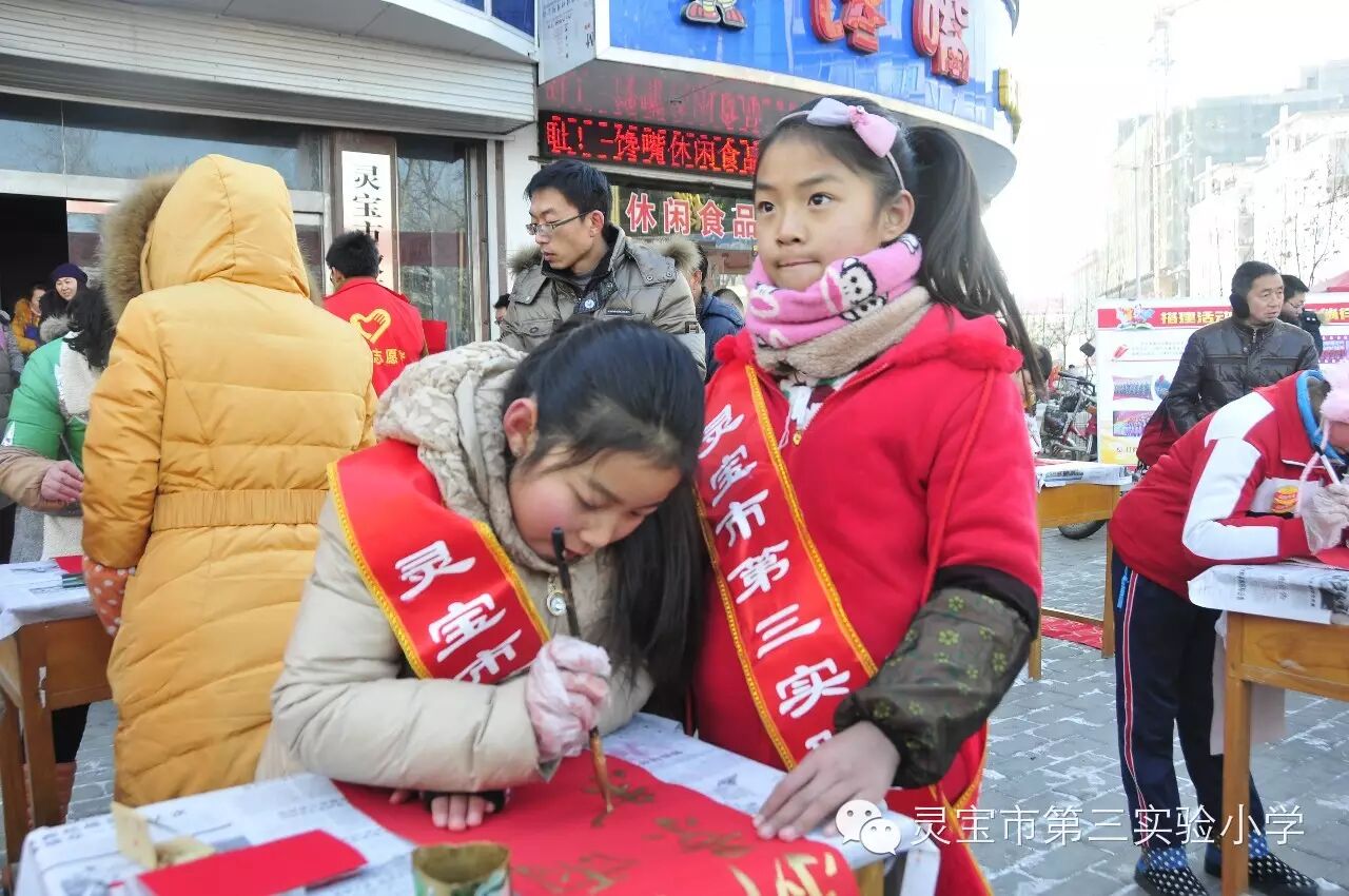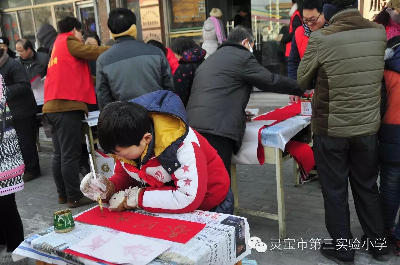 过年写春联、贴春联是我国的传统风俗,为给灵宝父老乡亲送上浓浓的喜气和新年的祝福,灵宝市第三实验小学师生们和灵宝市硬笔协会老中青书法名家们不畏严寒,给灵宝市的父老乡亲义写春联。他们书写的桌前挤满了广大群众,“大、小书法家”个个提笔研墨,不顾疲倦地满足广大群众的拜求,不少市民还自己选定春联内容,让其书写。短短4个小时,百余名群众欢天喜地领取了自己喜欢的春联。灵宝市第三实验小学举行的“义写春联 回馈社会”活动,已经成功举办了十一届。为居民群众送上特殊“年货”和新年祝福的同时,也营造喜庆的节日气氛,传递了浓浓的年味。通过这样有意义的公益活动,培养学生服务社会的意识。