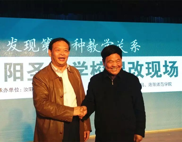 2当圣陶遇到杜郎口4月7日上午,山东茌平杜郎口中学校长崔其升与河南汝阳圣陶学校校长王天民两个人的手紧紧地握在了一起,这是两个人第一次见面,第一次握手。这一画面被定格成本次会议最具历史价值的画面。