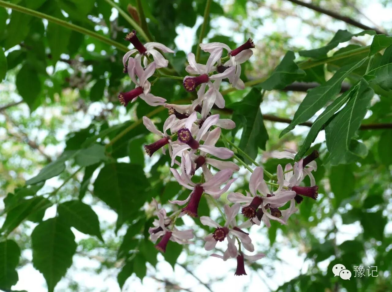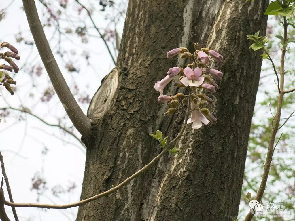 泡桐,树干通直,树枝较为稀疏,但树冠宽阔,树皮呈黑褐色。我觉得最有辨识度的是泡桐的花,粉紫色,呈喇叭状,内藏淡黄色的花蕊,春季开花,飘香四溢。一簇簇,挂满枝头。不仅如此,泡桐花味苦性寒,有疏风散热、清热解毒、清肝明目的疗效。