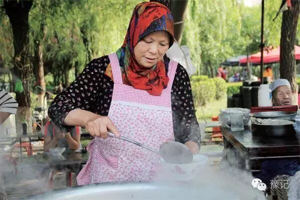 卖胡辣汤的商贩用木勺子舀了一勺汤,故意高高扬起,然后轻轻呈细流往下倒,一边倒一边嘴里大声吆喝着:“刚出锅的胡辣汤,好喝哩很!”卖羊肉冲汤的商贩无需叫喊,身边的汤锅里咕嘟嘟冒着喷香的热气,围着白围裙的商贩端坐在案板前,将七八成熟的羊肉切得薄溜溜的,不多时案板上的羊肉片便堆积如山。