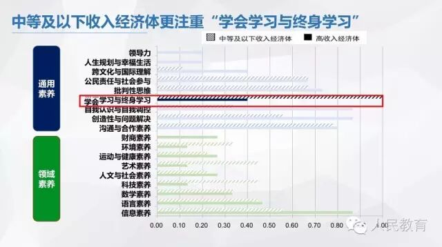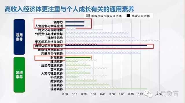 通过比较发现,无论收入水平高低,不同国家和地区对语言、数学、人文与社会、运动与健康、批判性思维、沟通与合作、公民责任与社会参与等素养的关注程度基本相当;较之中等及以下收入经济体,高收入经济体更加关注信息素养、创造性与问题解决、跨文化与国际理解,特别是自我认识与自我调控;而中等及以下收入经济体更加重视科技素养、艺术素养、环境素养,特别是学会学习与终身学习;值得一提的是,财商素养、人生规划与幸福生活以及领导力仅为高收入经济体所关注。具体内容见图4。