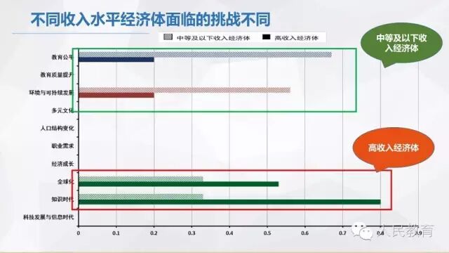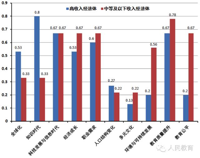 从不同收入水平经济体的比较看,无论收入水平高低,其教育都面临着科技发展与信息时代、经济成长、职业需求、质量提升的压力;比较而言,高收入经济体对“全球化”和“知识时代”可能带来的影响更为敏感;相反,中等及以下收入经济体对“教育公平”和“环境与可持续发展”的关注更加迫切。