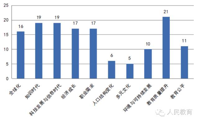 分别为:时代与科技变革类动力因素,如全球化、知识时代、科技发展与信息时代;经济与社会发展类动力因素,如经济成长、职业需求、人口结构变化、多元文化、环境与可持续发展;教育发展类动力因素,如教育质量提升、教育公平。