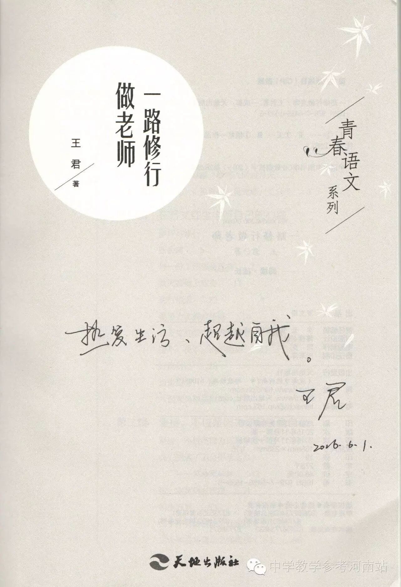 翻开每本书的扉页,都有王君老师洒脱漂亮的亲笔签字:“热爱生活,超越自我”、“让日子像鲜花,一朵一朵绽放”、“一路修行教语文”。