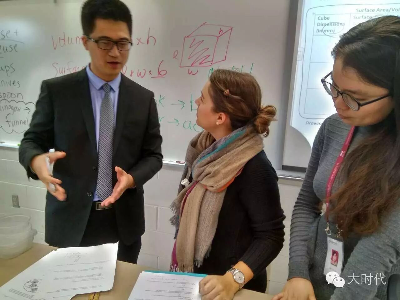 接着听了一节生物课。这节课主要讲一个问题,为什么细胞会裂变而不会无限膨胀?所有学生都参与到一个简单实验中,用刀切出正方体。与其说是实验,不如说是简单的手工。于是,学生们嘻嘻哈哈地按照老师的要求做了实验。我们听课的老师皱起了眉头,觉得解释这个问题完全没必要浪费这么多时间,如果我们老师来讲的话,十分钟就讲清楚了,我们的北大博士张伟老师做了如下课堂设计:
