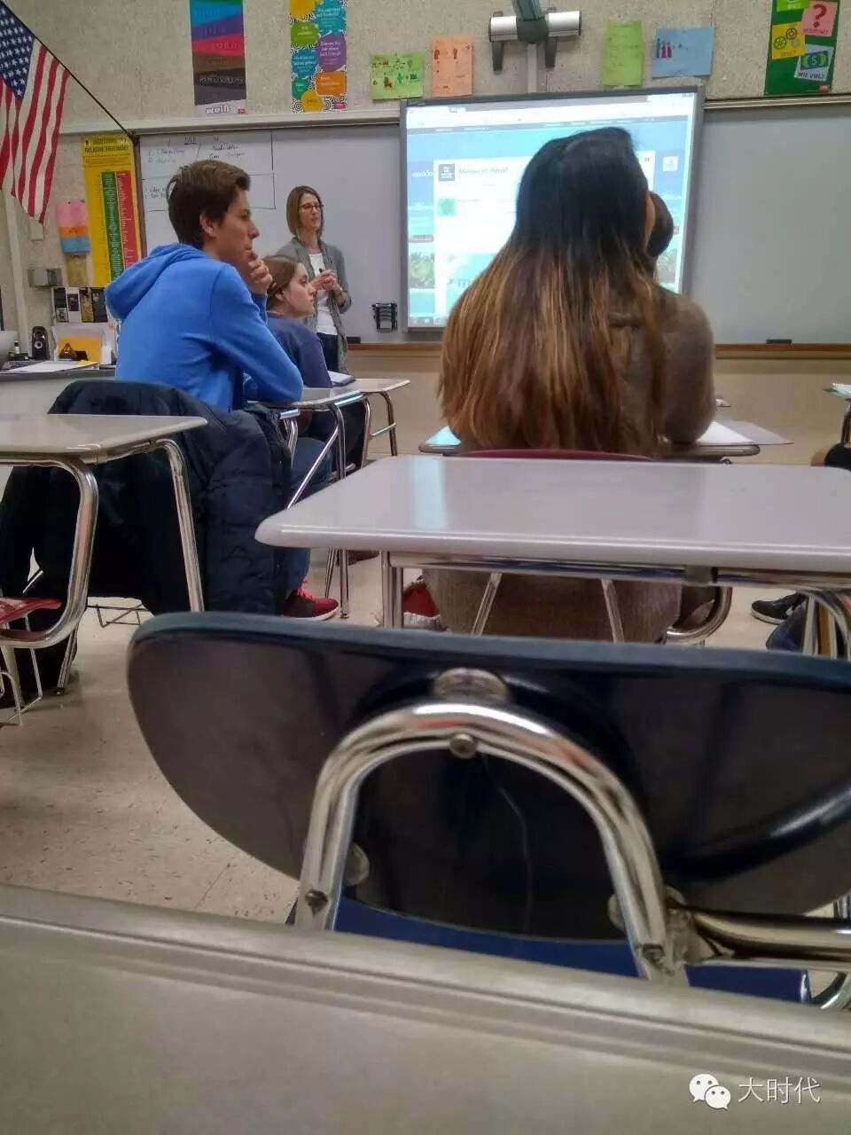 数学课的落实就更差了。整个一节课讲了一个求直角三角形边长的题,属于我们小学四、五年级的数学题,结果这帮美国初中生(七年级)忙活了一节课。场面很热闹,又是讨论,又是上讲台去演算,看起来大家兴趣盎然,但没有干货,没有落实。用我们数学老师的话来说,这堂课效率很低,这是我们小学四年级花十分钟就可以解决、再花十分钟练习,就可以落实的数学知识。美帝的数学课真的是“少慢差费”啊!看得我们的数学老师真捉急。