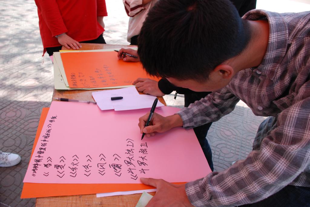开幕式结束后,首先进行了“有好书我推荐”环节,由参与者向大家推荐的书名及推荐理由;接下来是书香校园励志标语征集环节,参与人员每写出两条标语可获得卡片一张;最后一个环节是“记忆大师”,参与者抽题,在一定时间内背出或写出所抽到的题目,回答无误后可获得卡片。在各个环节获得的卡片可以在现场兑换各种精美礼品,同学们都摩拳擦掌,跃跃欲试。本次活动在同学们的欢声笑语中也落下了帷幕。