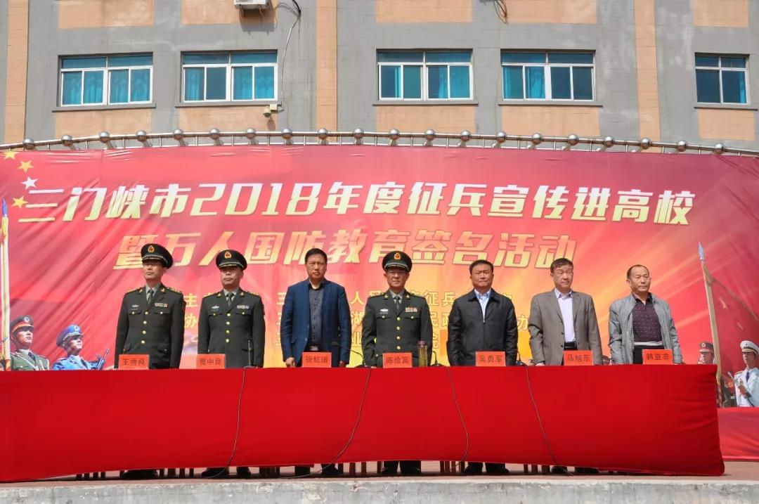 近日,三门峡市2018年度征兵宣传进高校暨国防教育万人签名活动我校文化广场举行。三门峡军分区副司令员陈俭富,三门峡市人民政府副秘书长张红谱,校党委副书记、校长吴勇军,党委委员、副校长马旭东和校武装部部长、保卫处处长韩亚非等领导出席活动。我校万余名学生现场接受了爱国主义、兵役法规、国家安全形势等教育。