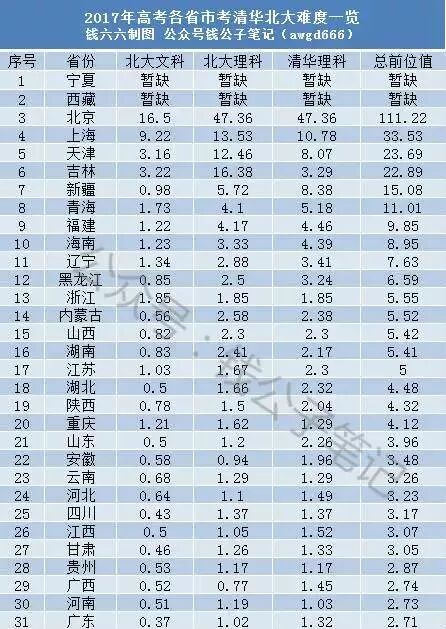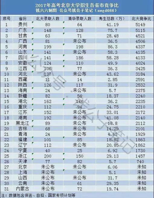 上图是根据清华北大公布的各省市实际录取总人数,与各省考试总人数的比值。数据不全,北京、上海地区至今未公布录取了多少人(原因你懂的)。我们以数据相对较全的北大录取人数进行计算,竞争最激烈的前五名依次是贵州、广东、甘肃、广西、河南,名单和以前位值计算一致,只是位次略有不同。河南的位次略有下降,原因是受益于北大的筑梦计划和清华的自强计划,这两个计划以经济落后及边远地区的学生为招生对象,最低可降分至一本线录取。河南经济欠发达地区还比较多,故而招生名额较多。而山东位次上升,广东位次几乎不变,是因为这两省处于沿海经济发达地区,符合筑梦计划、自强计划招生条件的考生少,只能靠高分去考清华北大。