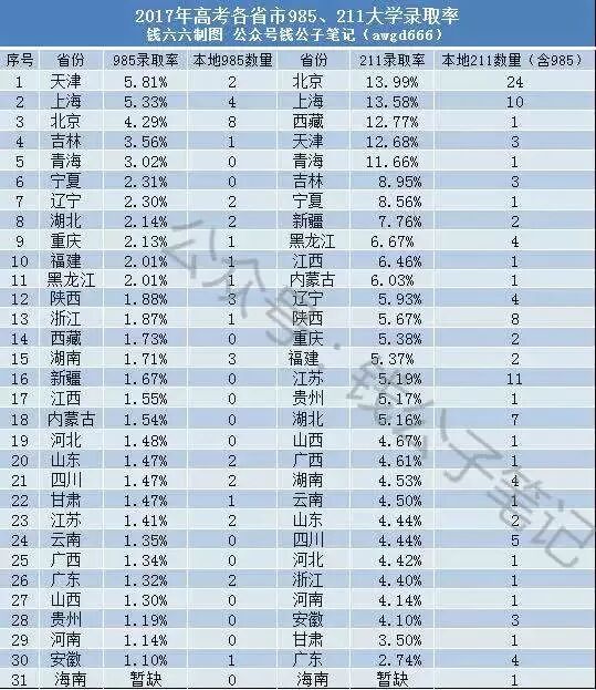 如果说考上清华北大相当于古代中状元,那么考上985大学就是中了进士。古有“三十老明经,五十少进士”之说,可见中进士之难。今天,能考上985大学,也必是人中龙凤。试看各省市985大学的录取率。