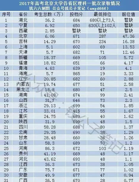 难度由高到低前十名,分别是广东、河南、广西、贵州、甘肃、江西、四川、河北、云南、安徽。最容易的是京津沪,以及东北、边疆地区(不计算西藏宁夏)。湖北理科考北大分数线为684,680分以上有73人,推测684分在全省排位50名左右,以50代入计算,湖北难度在31个省市中排14名左右。