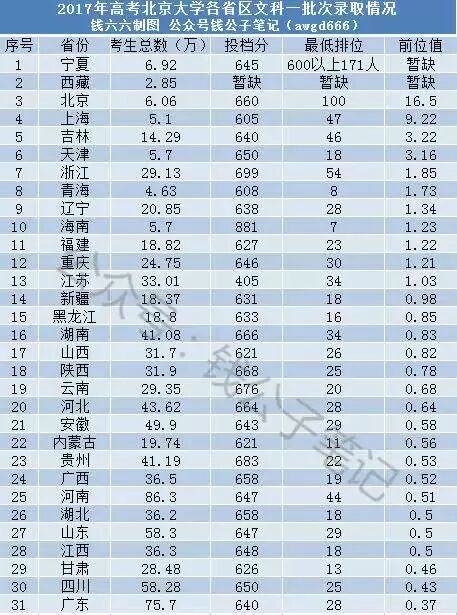 数据取2017年北京大学文科、理科以及清华大学理科三科招生。因清华主要是工科大学,文科招人太少,个别省份甚至仅招2人,样本意义偏小,且因录取分数太高,一半省份无法获得考生的具体排位,故而不计算清华文科的前位值。