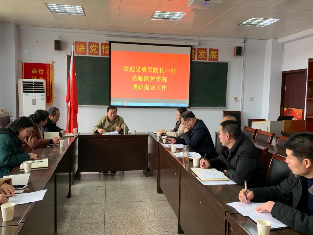 近日,院长吴勇军深入医护学院调研指导工作,学工部部长、学生处处长黄世谋、教务处处长万平陪同调研。医护学院院长马志刚、党总支书记杨丽波及教学科、学生科、实训室、办公室等负责人参加了座谈会。
