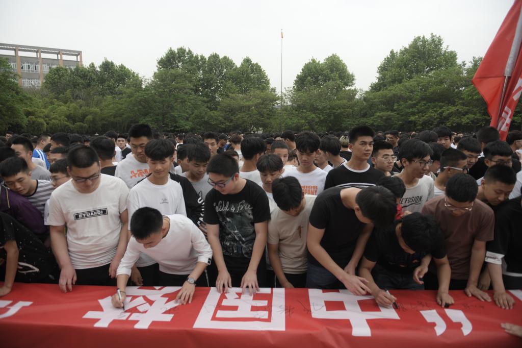 仪式结束后,与会领导与我校六千余名大学生在征兵宣传条幅上签名,共唱《歌唱祖国》。