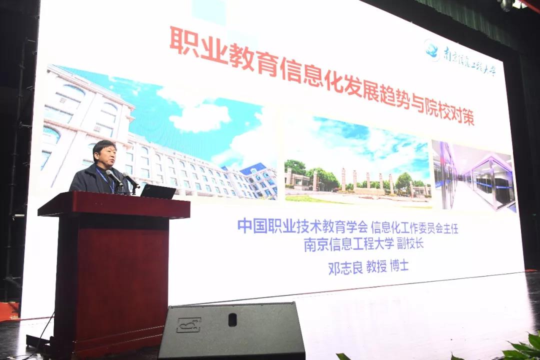 中国职业技术教育学会信息化工作委员会主任委员、南京信息工程大学副校长邓志良作题为《职业教育信息化发展趋势与院校对策》的报告