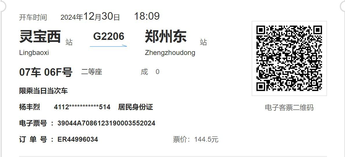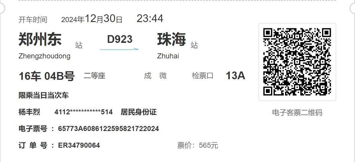 2024年12月30日下午,我从灵宝西站乘坐G2206在郑州东站换成D923去珠海。
