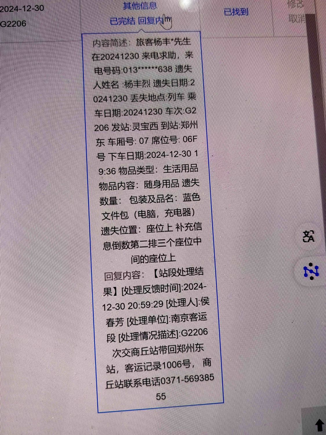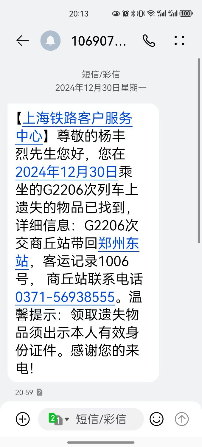 20:59,终于收到上海铁路客户服务中心发来的短信:遗失的物品已找到,G2206次交商丘站带回郑州东站,客运记录1006,请联系商丘站......