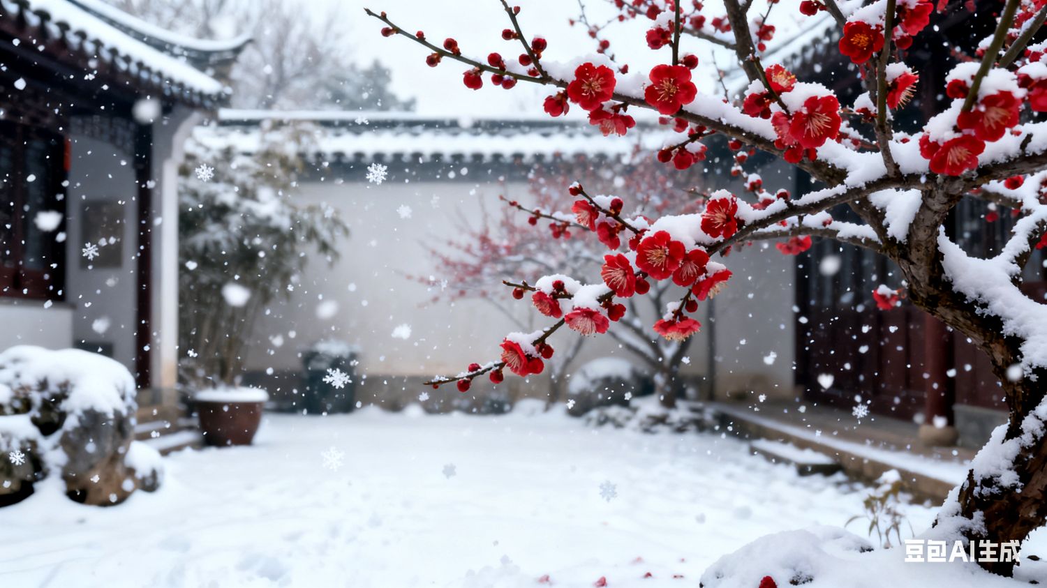 夜来雪花飘,冬日乐陶陶。小院红梅开,风骨冶情操。