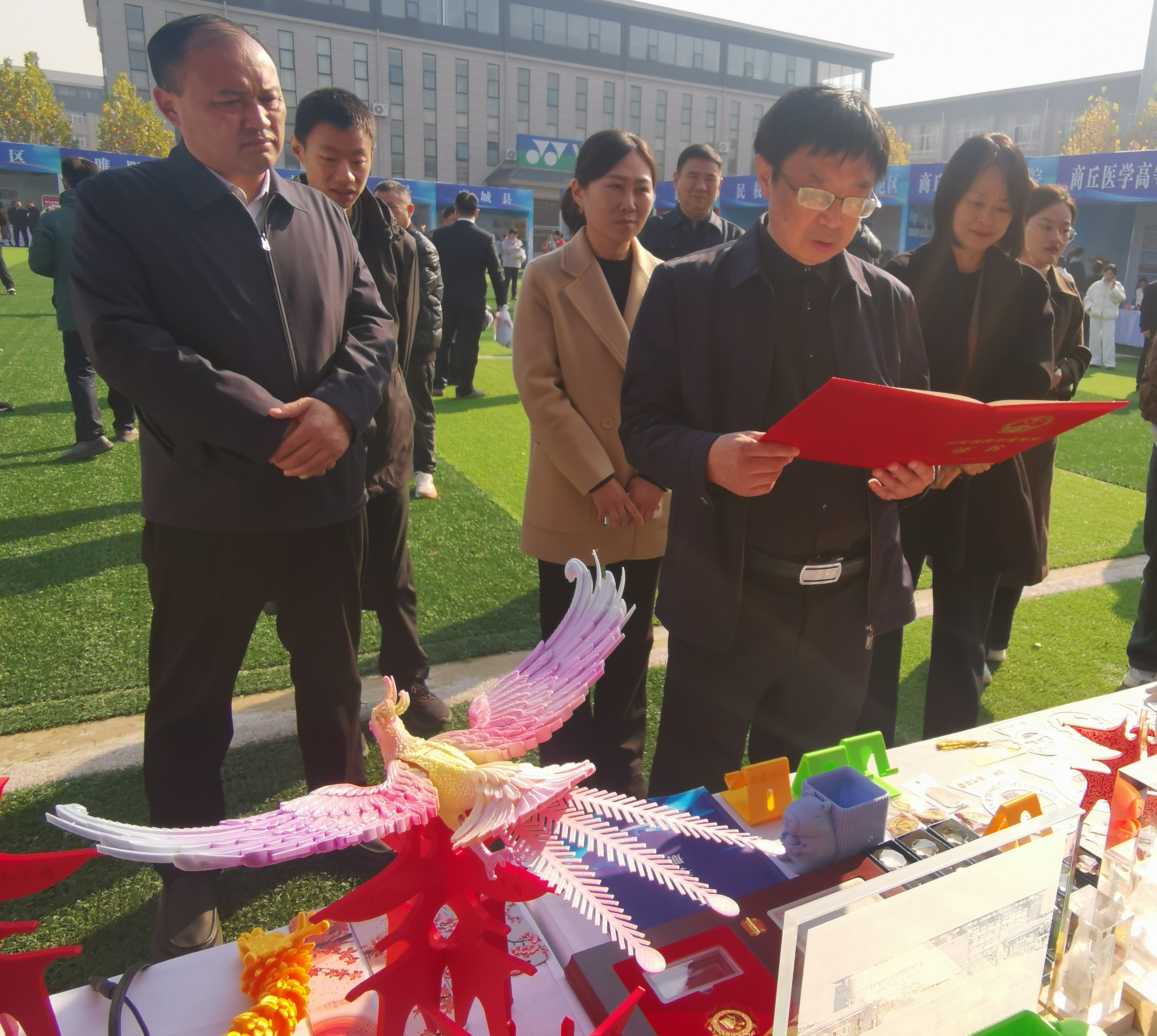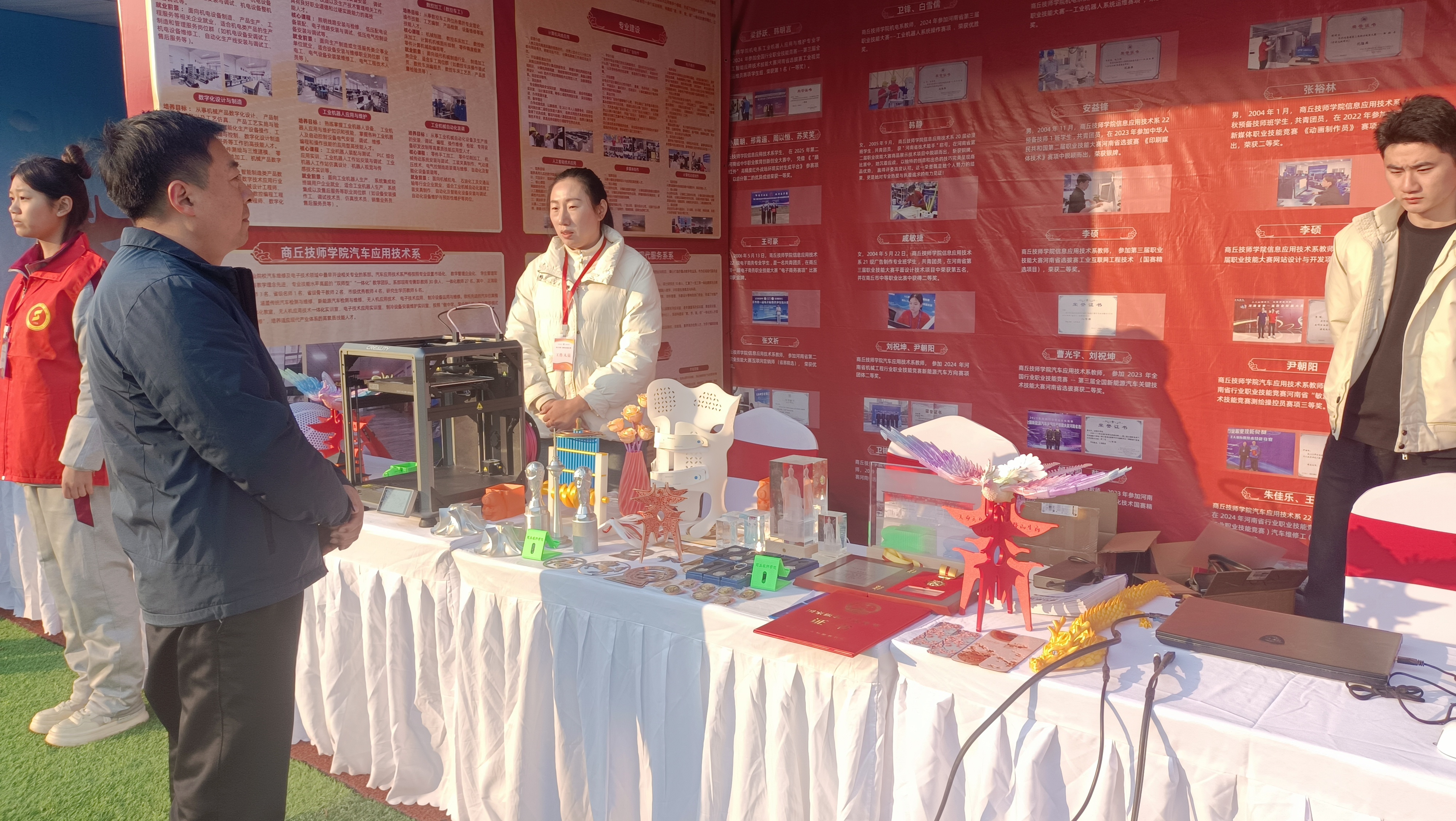 其中,技师学院数字化设计与制造专业产教融合成果展示成为全场焦点。3D打印现场“诞生”的美人鱼、金黄色盘龙、“玄鸟生商”地标模型,带有校徽标志的笔筒与手机支架,让师生们爱不释手;激光切割、激光打标、激光内雕而成的王亥像、商字地标、学校办公楼等作品栩栩如生,引得观众纷纷合影留念;三维扫描仪“即扫即得”的便捷体验,五轴加工打造的大力神杯、气轮机叶轮模型,更是展现了智能制造的硬核实力。省市领导驻足观摩,对学院在新时代智能制造技能人才培养方面的突出成果给予高度评价。学院形象设计专业的展示区成为一道引人注目的风景线。三名形象设计专业学生以精湛技艺呈现的"古今交融"主题妆容造型,将美妆与造型艺术展现得淋漓尽致。他们巧妙融合传统美学与现代设计,无论是唐制汉服妆造中融入的玄鸟意象,还是宋制妆容展现的大宋雅韵,都令省市领导及参观者赞叹不已。而学院教师斩获的劳动教育“国家教学成果”二等奖,更成为办学实力的有力佐证,彰显了技师学院在技能人才培养领域的标杆地位。
