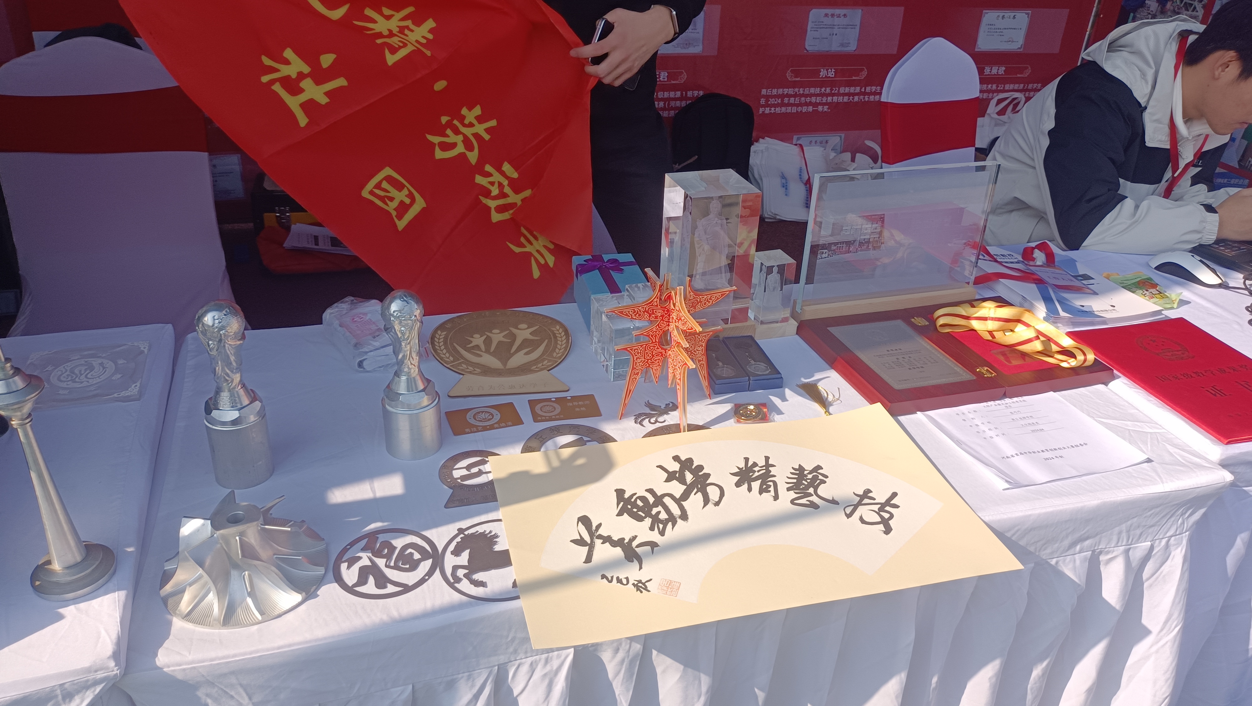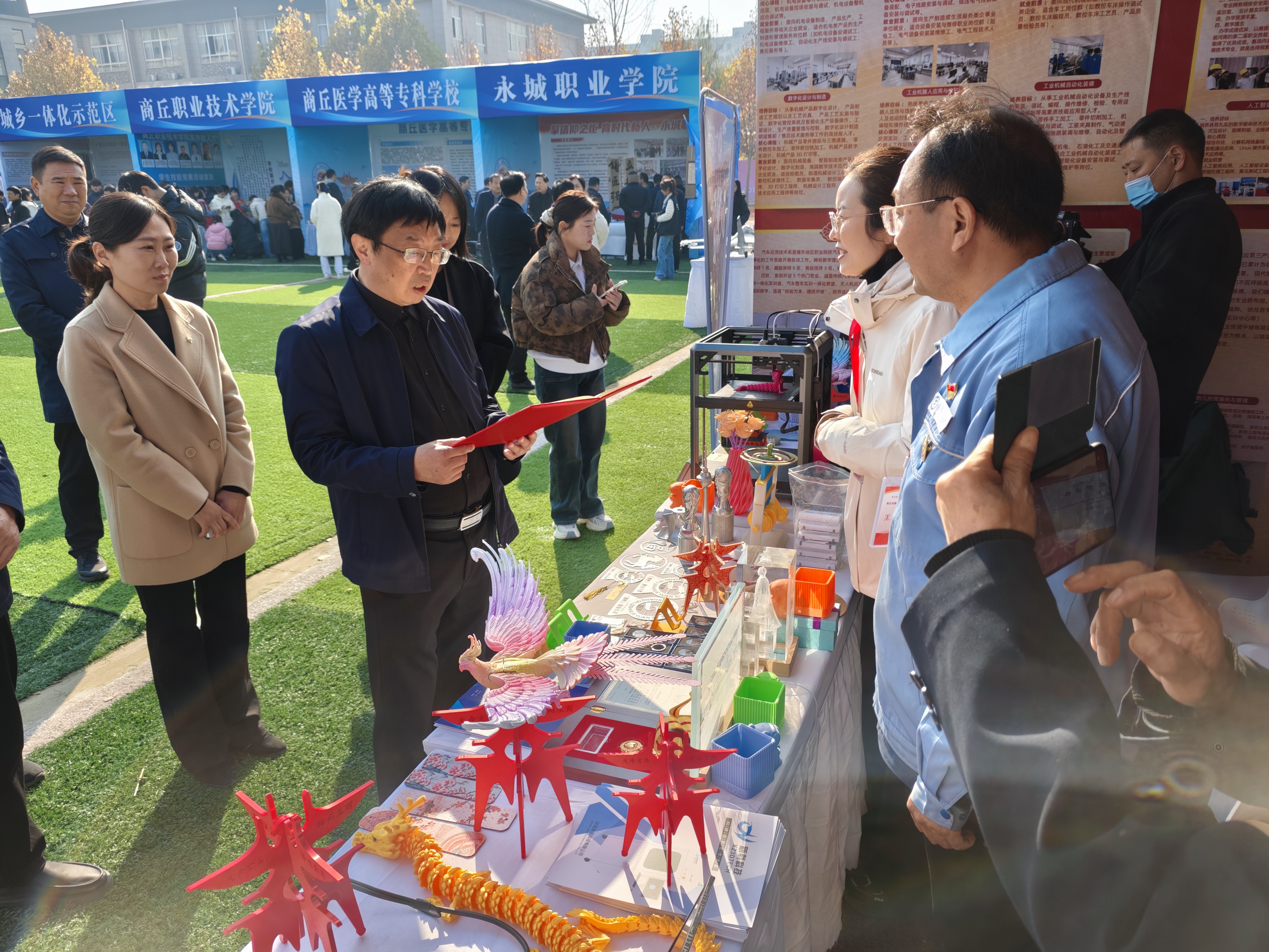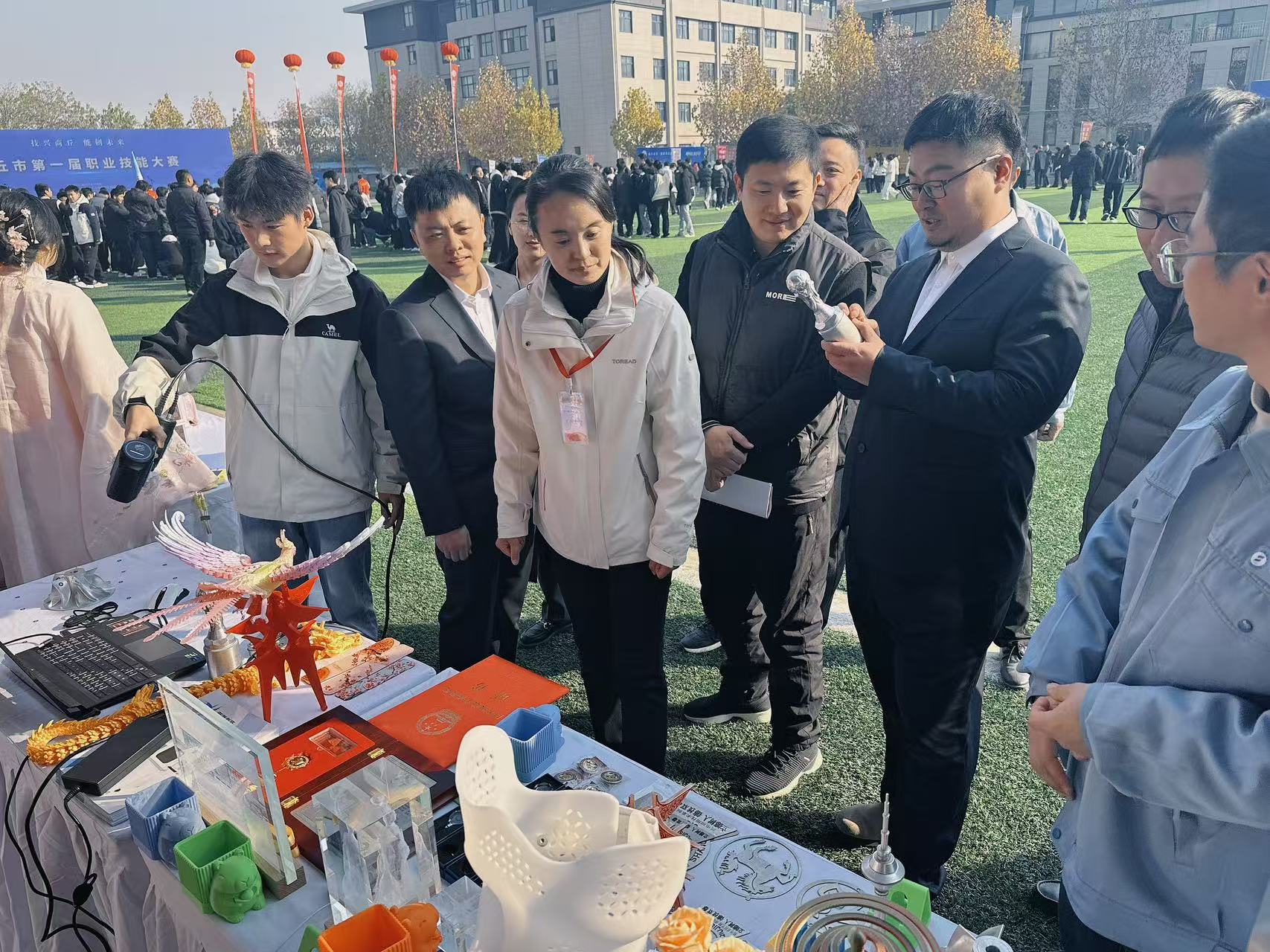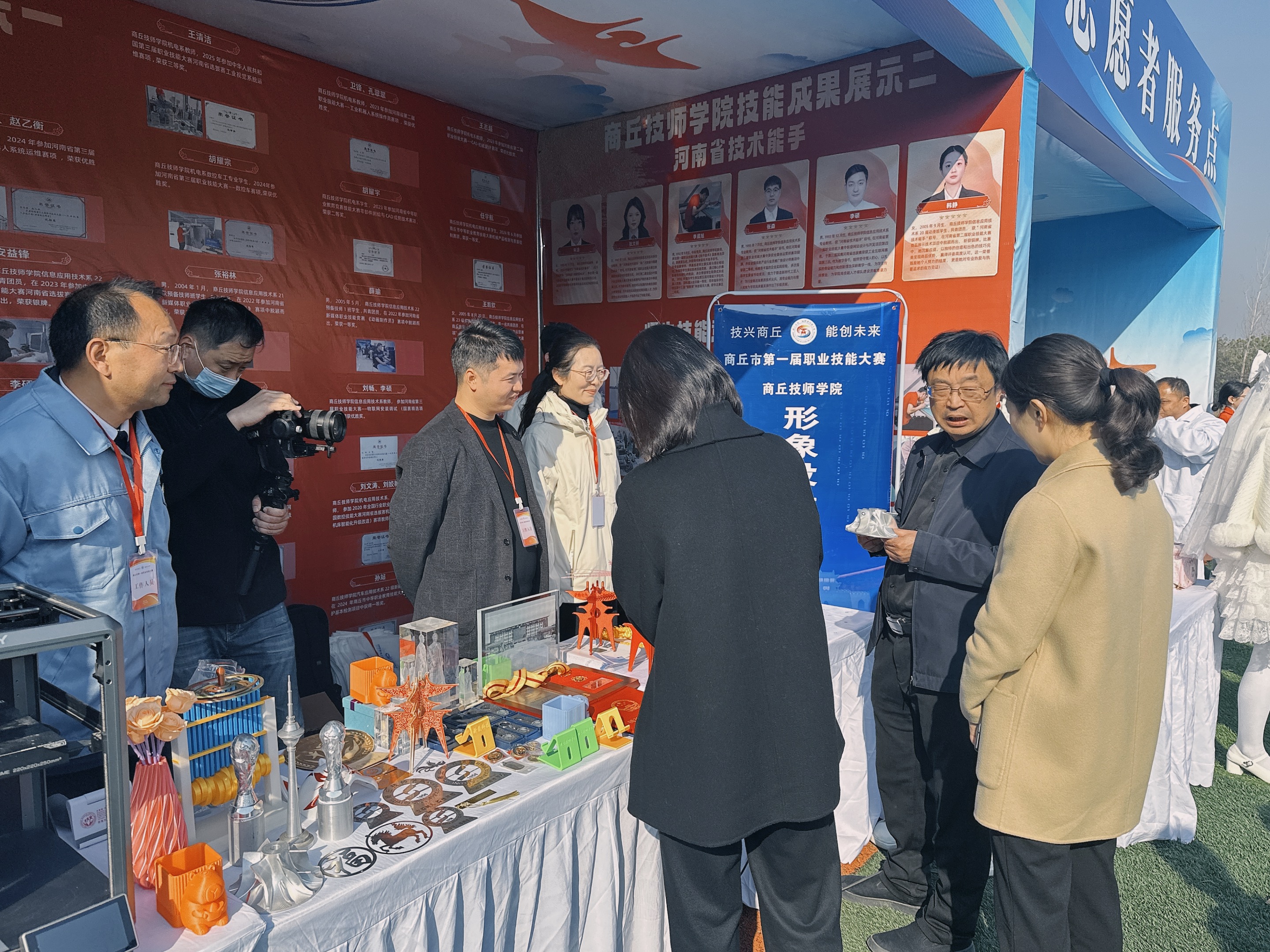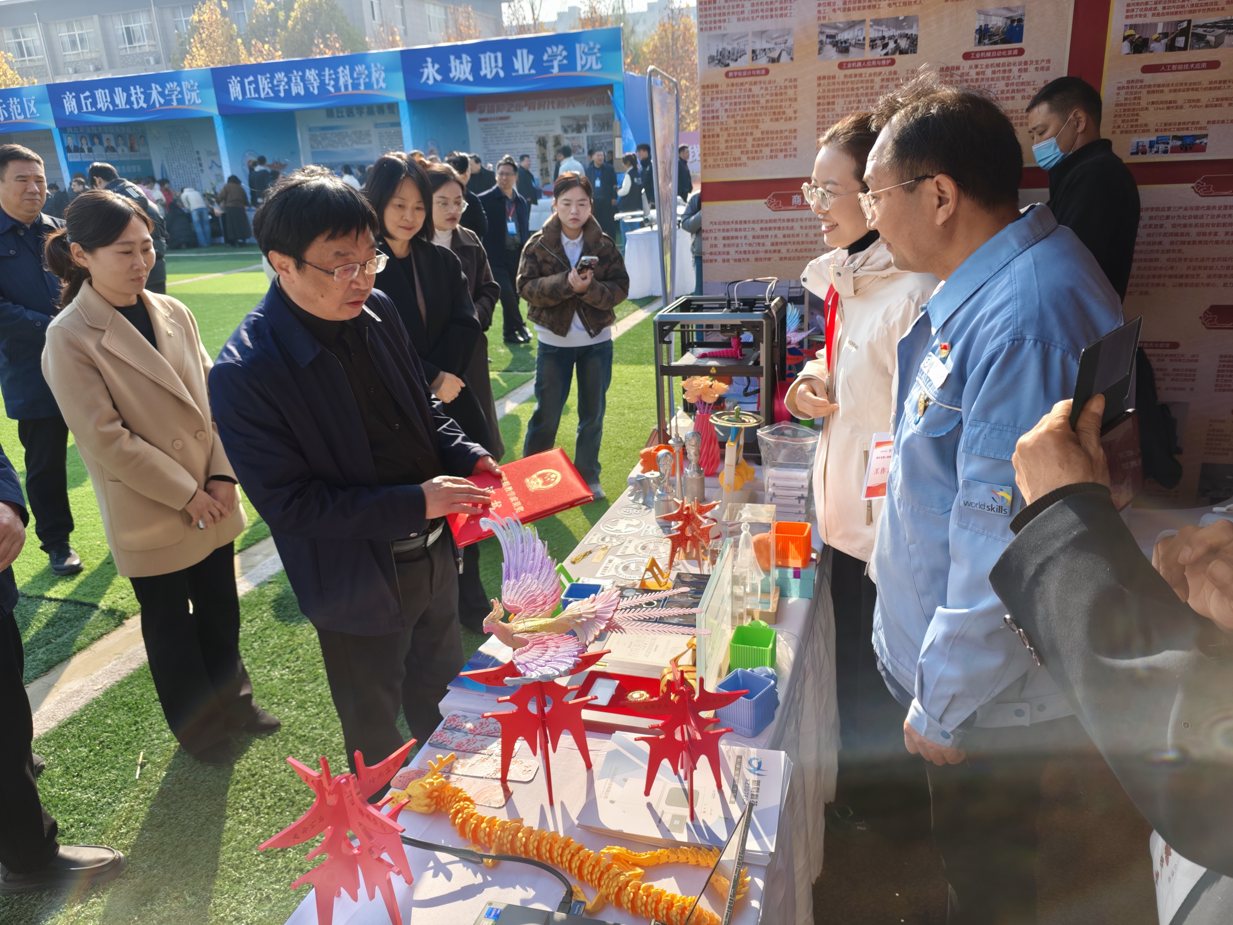 其中,商丘技师学院的展示区成为全场焦点。数字化设计与制造专业的产教融合成果令人赞叹,3D打印现场制作的美人鱼、金黄色盘龙、“玄鸟生商”地标模型、定制笔筒等作品精致逼真,激光切割、激光打标、激光内雕的王亥像、商字地标、学校校徽等栩栩如生,手持三维扫描仪“即扫即得”的便捷操作,以及五轴加工的大力神杯、气轮机叶轮模型,充分展现了学院在智能制造技能人才培养方面的领先实力。省市领导驻足观摩,对学院的教学成果给予高度评价,特别提及学院教师在劳动教育方面荣获的“国家教学成果”二等奖,称赞这一荣誉是学院办学实力的有力证明。形象设计专业学生呈现的“古今交融”主题妆容造型,将唐制汉服妆造中的玄鸟意象、宋制妆容的大宋雅韵与现代设计巧妙融合,精湛技艺赢得了领导和参观者的一致赞叹。
