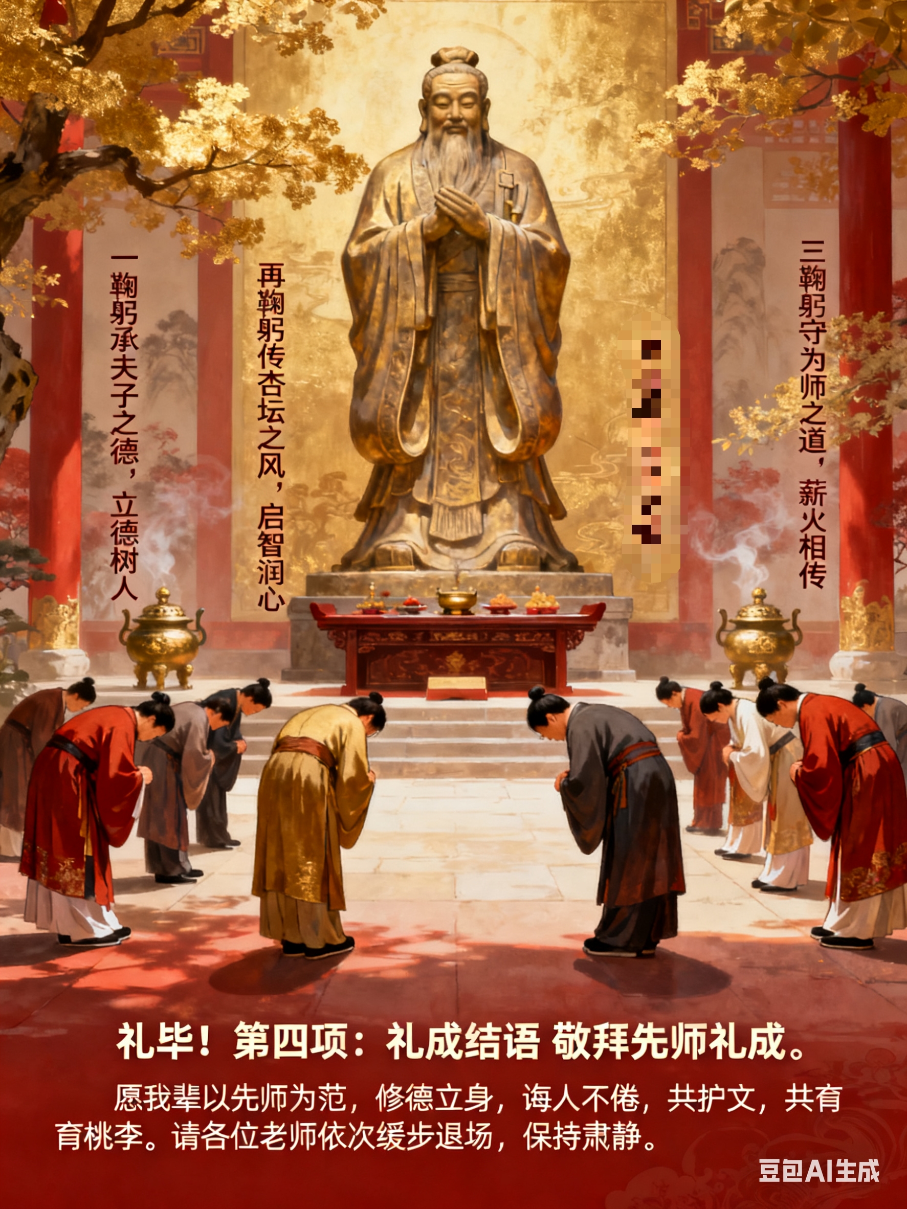 一鞠躬,承夫子之德,立德树人。 想起父亲在罗庄村、前进村、棘针庄村等农村小学执教的岁月,他何尝不是以孔子"有教无类"的精神,照亮农村孩子的求学路?职业教育更需如此,以德育为先,培养德技并修的大国工匠。