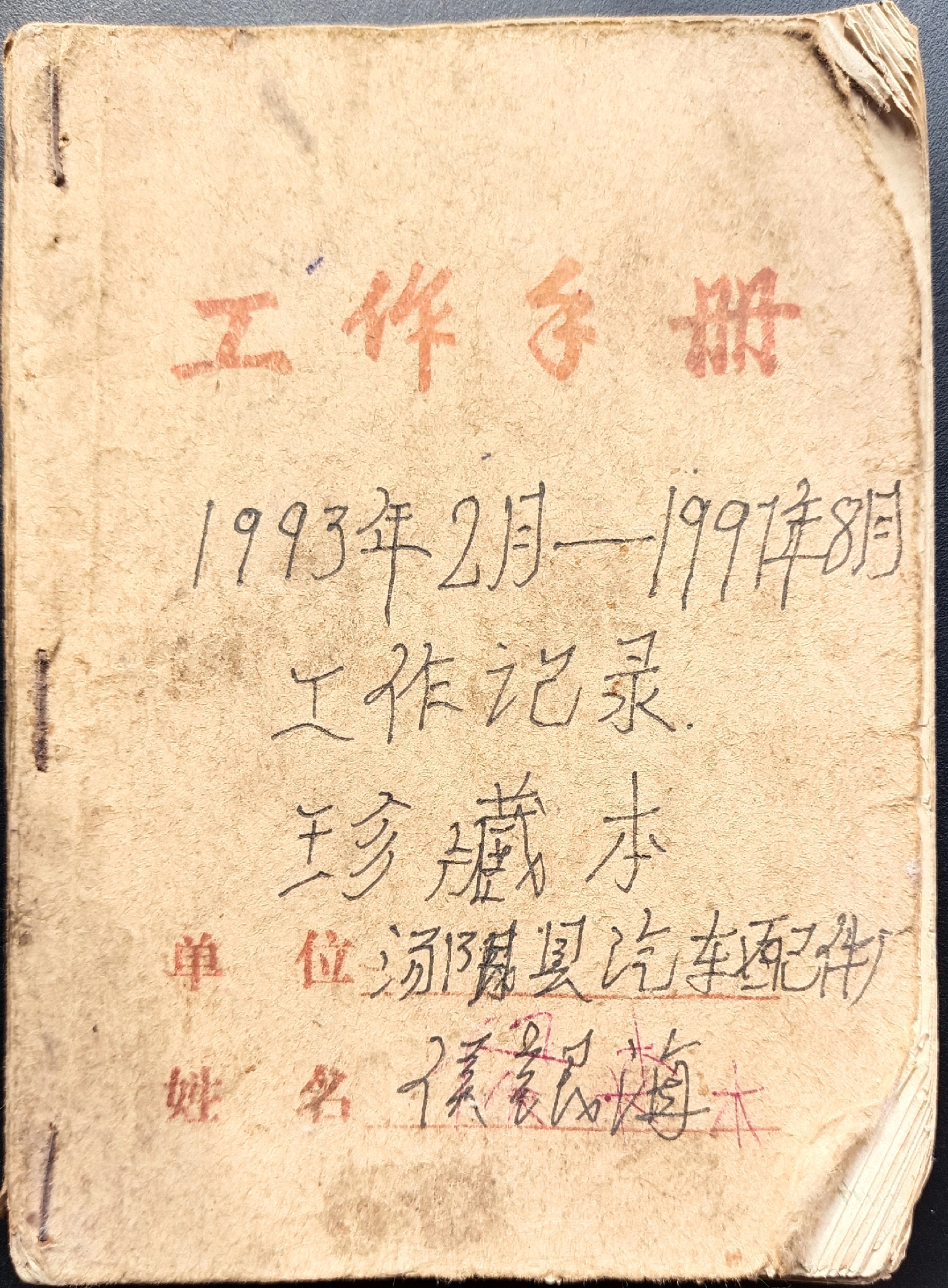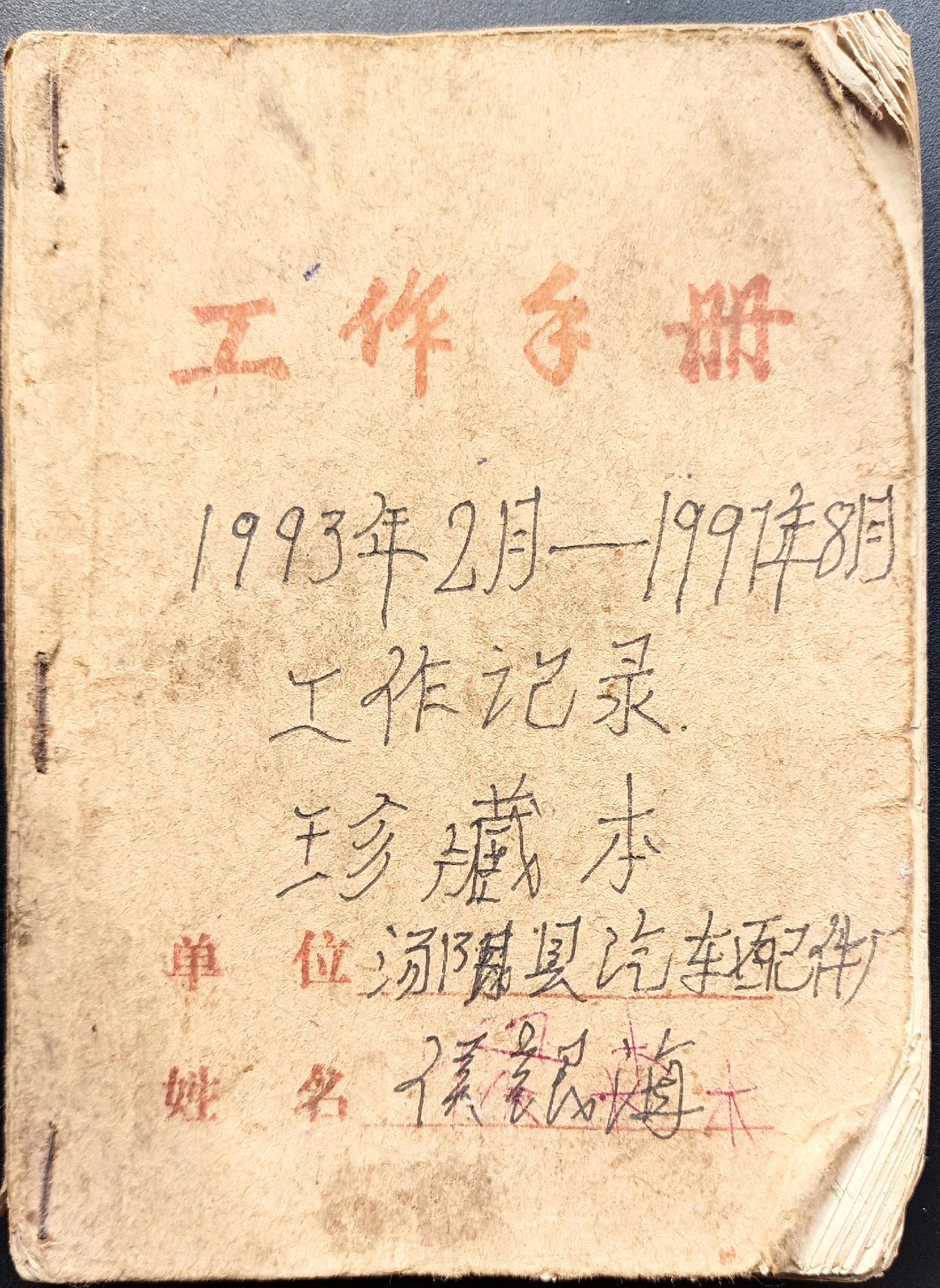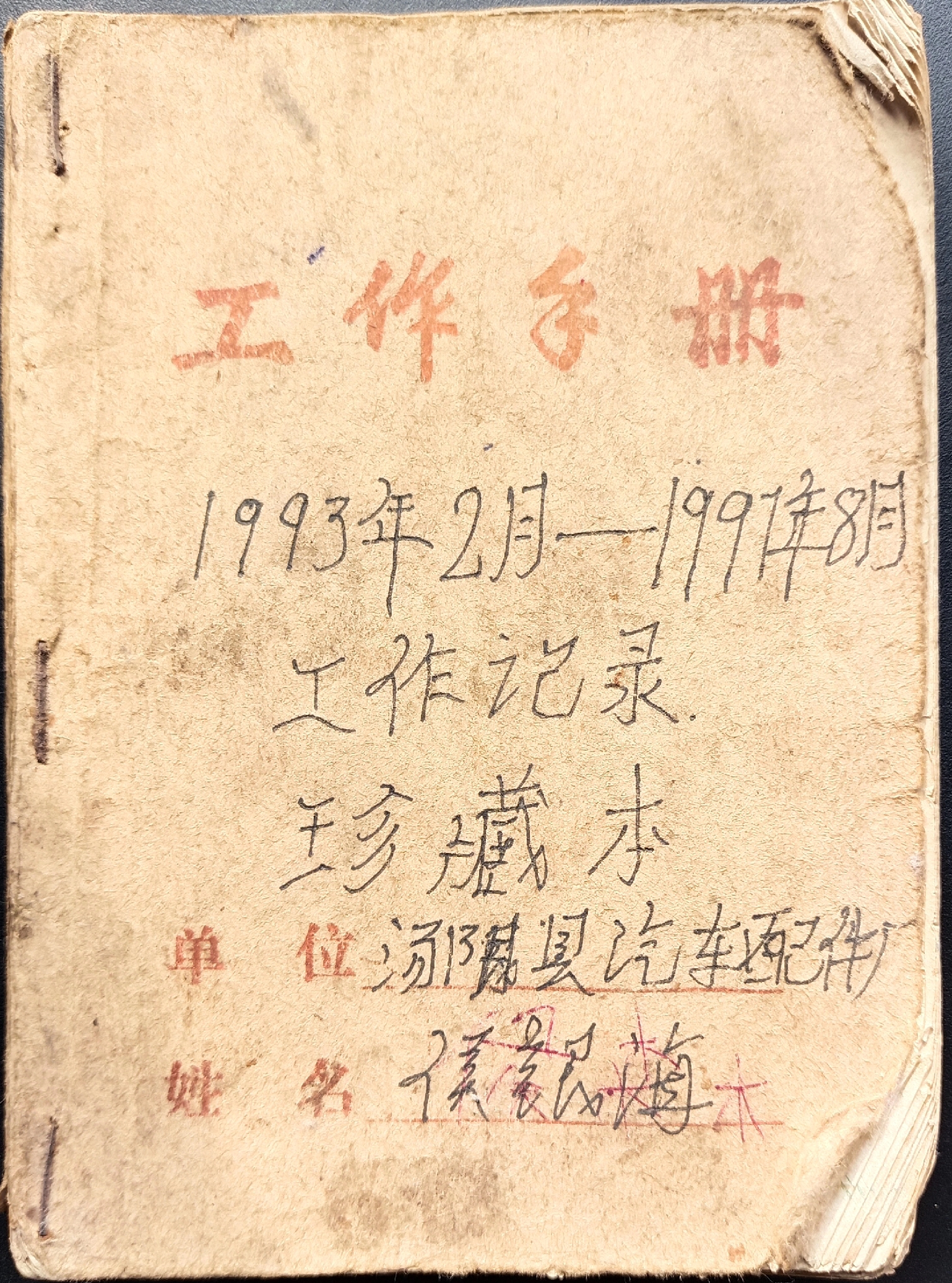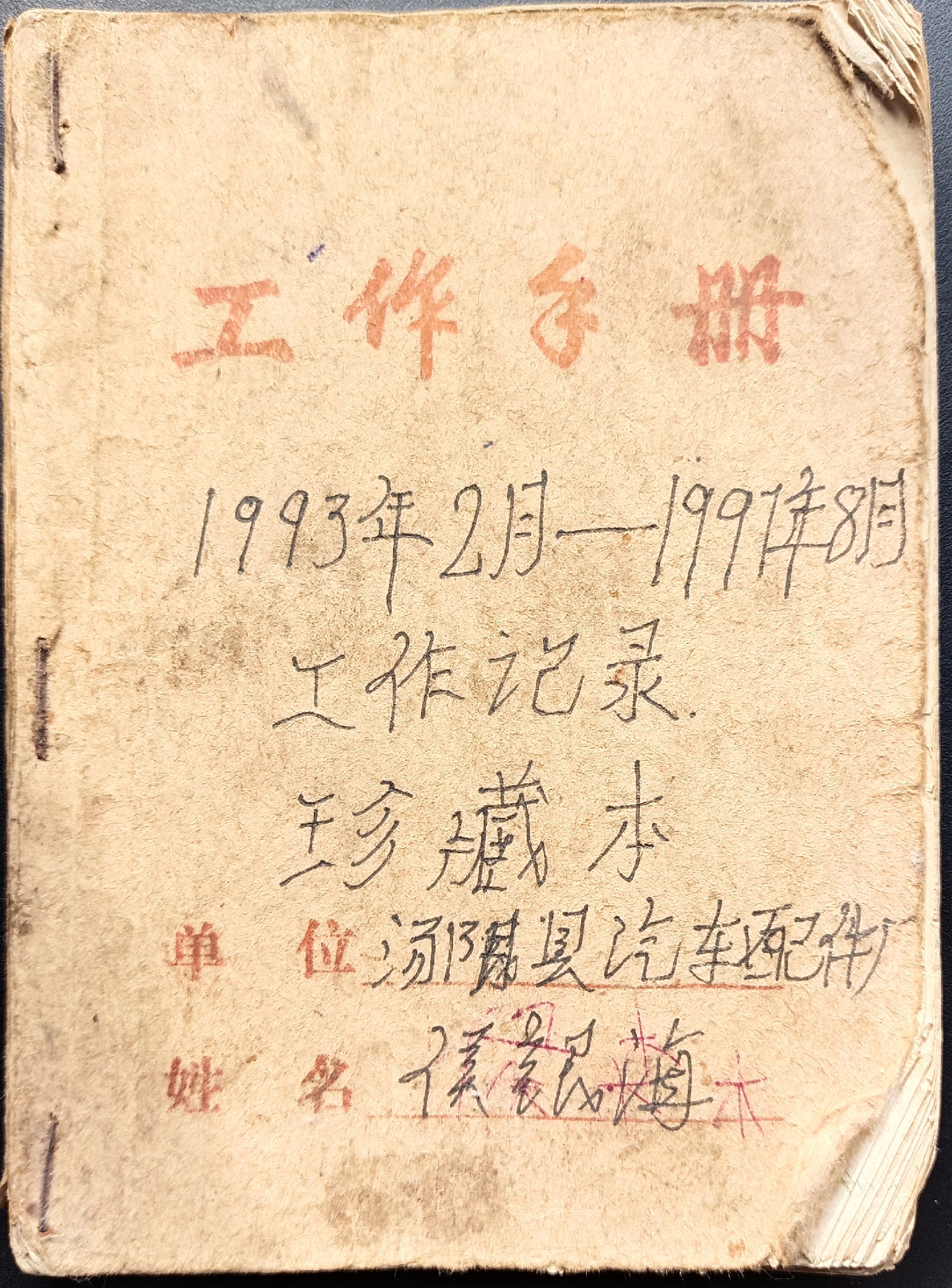 翻开1993年2月的扉页,"汤阴县汽车配件厂 机械加工车间 侯银海"的蓝黑墨水签名仍清晰可辨。这个刚满20岁的青年工人或许未曾想到,这本被他戏称为"车间日记"的手册,会成为解码中国产业工人成长的珍贵标本。