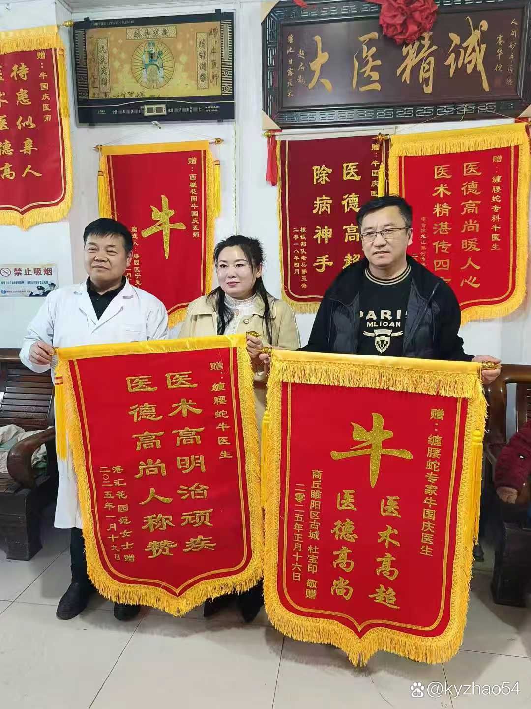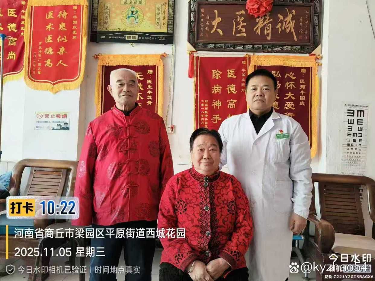 牛国庆的诊室,没有“贵贱之分”,只有“病痛之别”。从豫东乡村的农民,到都市白领;从汉族同胞,到回族、藏族、满族、畲族等少数民族患者,乃至远道而来的宝岛台湾同胞,都在他的诊室里感受到了“如至亲”的温暖。一位来自台湾的患者,因带状疱疹后遗神经痛辗转多地未愈,慕名找到牛国庆。经过两周的精心治疗,疼痛彻底消失,临行前他含泪赠予锦旗:“中原有神医,斩蛇断病根。”多年来,牛国庆治愈的患者逾万人次,诊室里挂满的锦旗与奖状,是他“医者仁心”的最好见证。《消费日报社》《京九日报社》等媒体曾多次报道他的事迹,但他始终淡然:“患者的康复,就是最好的奖章。”