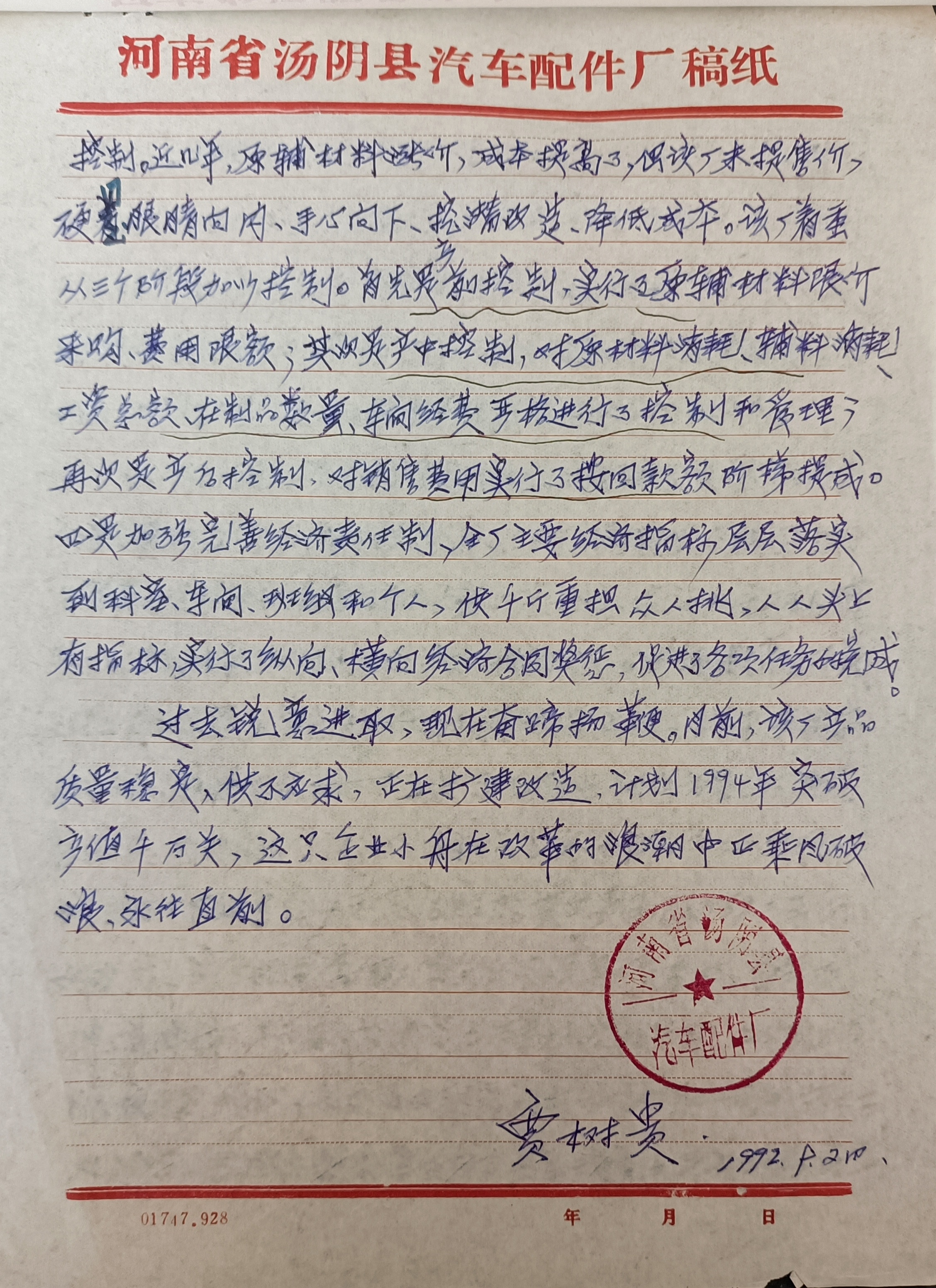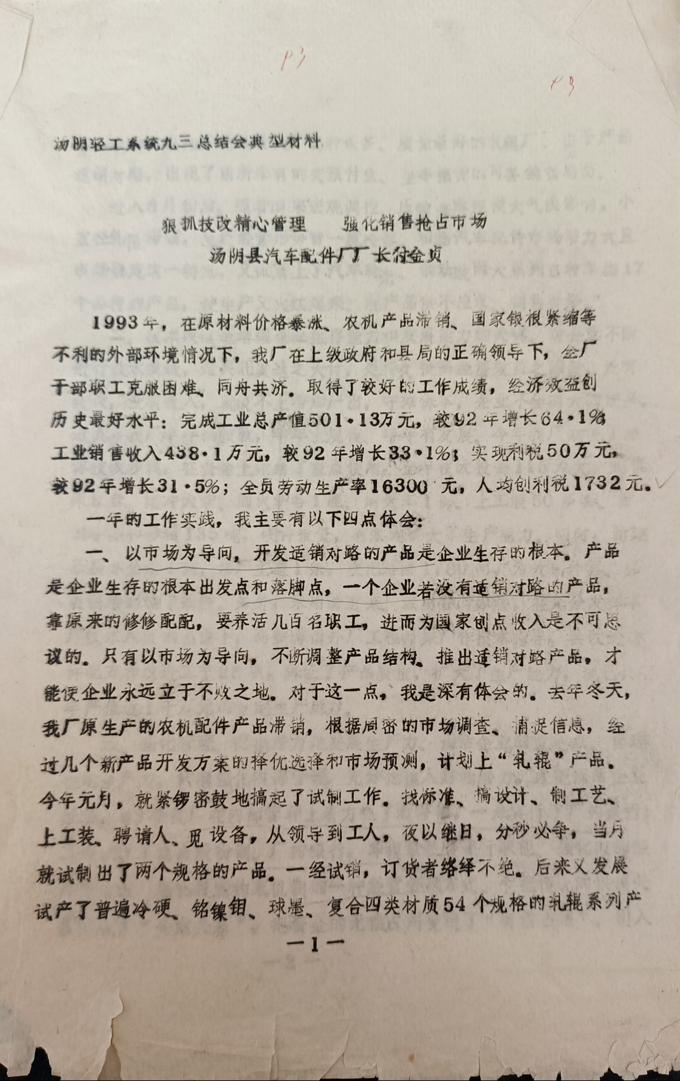 上世纪八九十年代的汤阴,工业星火正以燎原之势点亮县域经济的版图。作为轻工系统的“排头兵”,汤阴县汽车配件厂在1993年的总结会上,以一份沉甸甸的成绩单和鲜活的经验总结,为我们留下了改革开放初期工业企业“闯市场、求生存、谋发展”的生动注脚。今天重读这份泛黄的典型材料,字里行间跃动的不仅是数据与策略,更是一代产业工人“同舟共济、攻坚克难”的乡愁记忆。