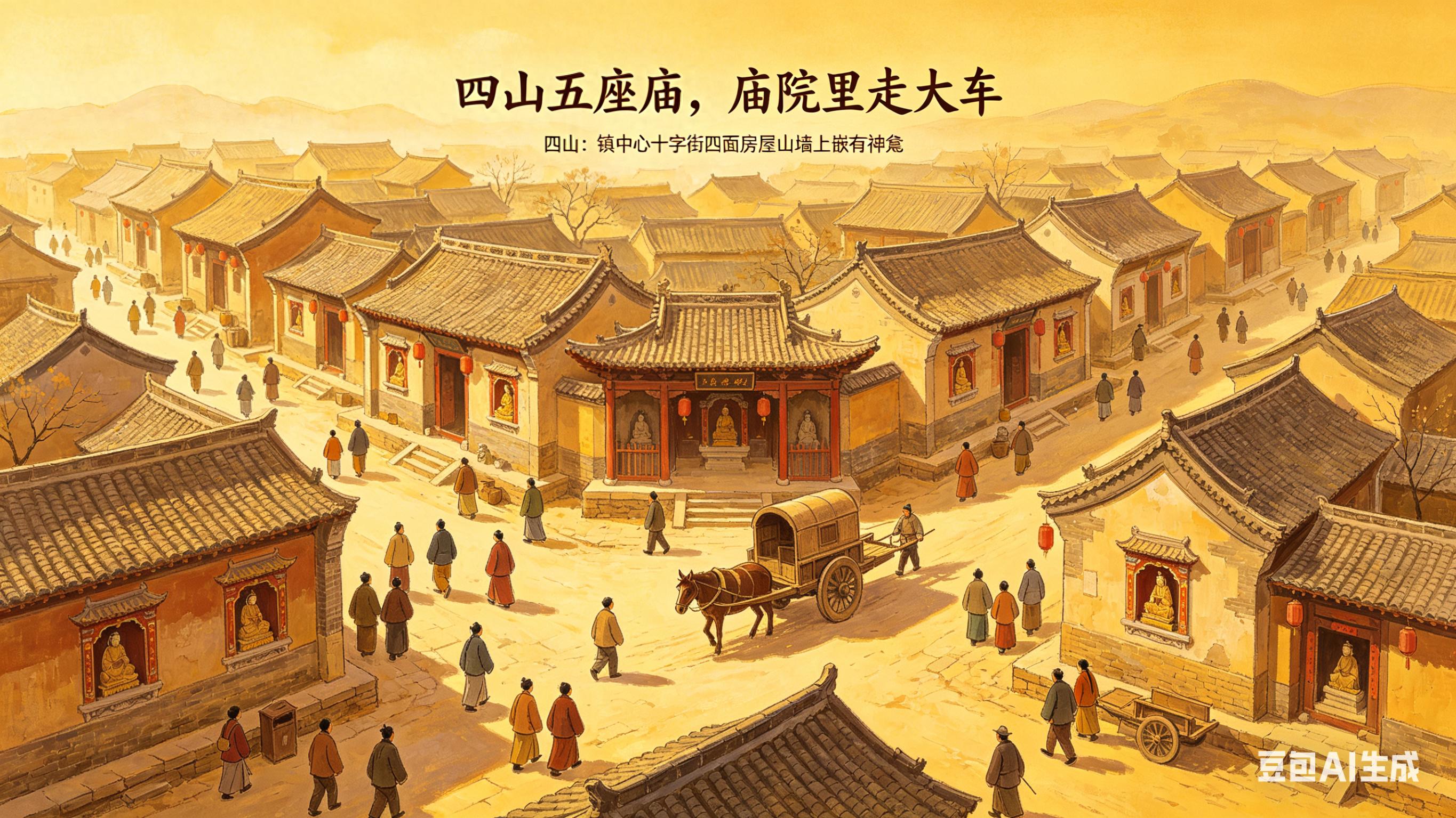 “四山”的设计堪称因地制宜的典范。匠人在房屋山墙上开凿神龛,嵌入神像或壁画,既节省用地,又赋予建筑神圣性。这种“以墙为山”的手法,既呼应了北方民居高墙深院的形制,又以象征手法营造出“山环水绕”的风水意象。而五座庙宇的布局,则体现了传统“街庙一体”的规划智慧。庙院开阔,既为节庆活动提供场地,又因道路通达成为交通节点,甚至能容纳马车穿行,展现出实用性与象征性并重的设计理念。