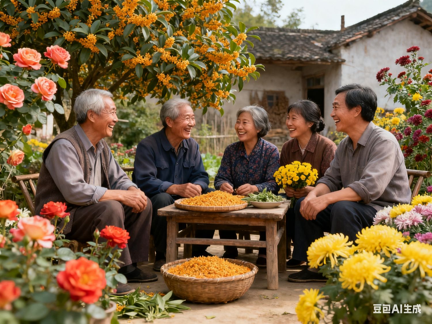小院桂花绽芬芳,月季盛开秋菊黄。风调雨顺年景好,缕缕幽香绕庭堂。