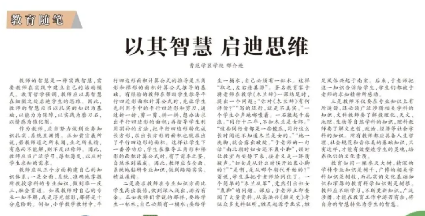 教师的智慧是一种实践智慧,需要教师在实践中建立自己的活动模式。教育哲学强调,教师应以其智慧在细微之处启迪学生的思维。因此,教师的智慧应当以扎实的知识为基础,以能力为保障,以实践为磨刀石,以情感为催化剂。